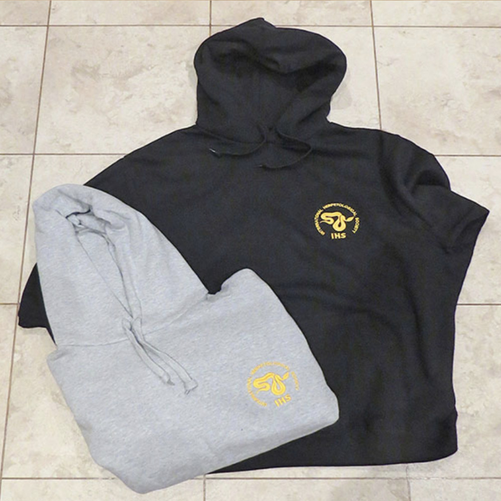 IHS Branded Hoodies are available in Black or Grey and feature a gold embroidered International Herpetological Society Logo. Size small is made to order so may take longer than other sizes to arrive.